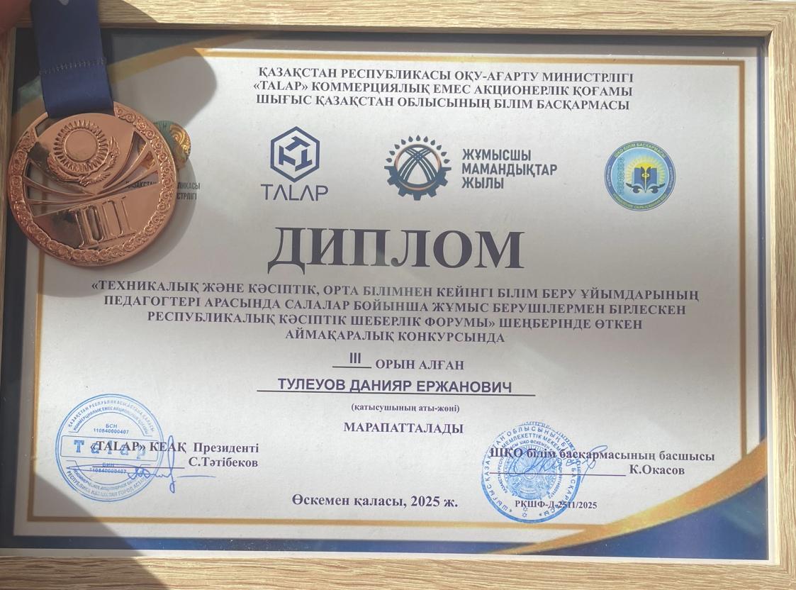 Жұмысшы мамандықтар жылы аясында 2025 жылы 14 - 16 қазан күндері Шығыс Қазақстан облысының білім басқармасы мен «Talap» КЕАҚ бірлесе ұйымдастырған «Техникалық және кәсіптік, орта білімнен кейінгі білім беру ұйымдарыңың педагогтері арасындағы салалар бойынша жұмыс берушілермен бірлескен республикалық кәсіптік шеберлік форумы» шеңберінде «Шығыс Қазақстан көп салалы колледжі» КМҚК базасында ауыл шаруашылығы саласы бойынша аймақаралық конкурсы өтті. Осы конкурсқа Абай облысының намысын қорғауға «Үржар колледжі» КММ - нен директордың оқу - өндіріс жұмыстары жөніндегі орынбасары А.Баймухаметова сарапшы - компатриот болып, оқу - өндіріс шебері Д.Тулеуов «Ауыл шаруашылығын механикаландыру» құзыреттілігі бойынша қатысып, ІІІ орын иеленді. Құттықтаймыз!!!