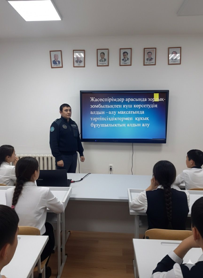 «Үржар колледжі» КММ-де «Адал азамат» бағдарламасының «Заң мен тәртіп» бағыты аясында өткізілген «Құқықтық сауаттылық апталығы — жастар бастамасы» апталығында Үржар АПБ ЖПҚБ УПИ полиция майоры Тұрсын Азаматпен «Жасөспірімдер арасында зорлық-зомбылық пен күш көрсетудің алдын-алу мақсатында тәртіпсіздіктер мен құқық бұзушылықтың алдын алу» тақырыбында кездесу ұйымдастырылды. Кездесу барысында полиция майоры Тұрсын Азамат заңды бұзудың салдары мен құқықтық жауапкершілік туралы жан-жақты түсіндіріп өтті.